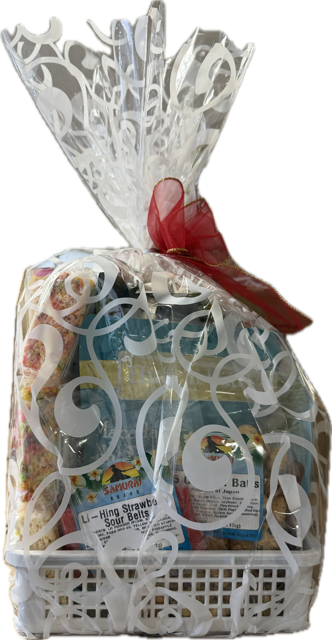 What's Inside: Furikake Popcorn, Moana Sweet & Salty Popcorn, Pistachio Crunch, Dried Sliced Mango, Premium Mango Gummies, Aloha Kine Creem Crackers, Thick Birthday Cake Marshmallow Crispy Bar, Giant Cherry Seed, Glazed Furikake Chips, Huff n Puff Macadamia Nut Delights, LH Strawberry Sour Belts, 5 Colored Balls, and delicious Mauna Loa Honey Roasted Macadamia Nuts.